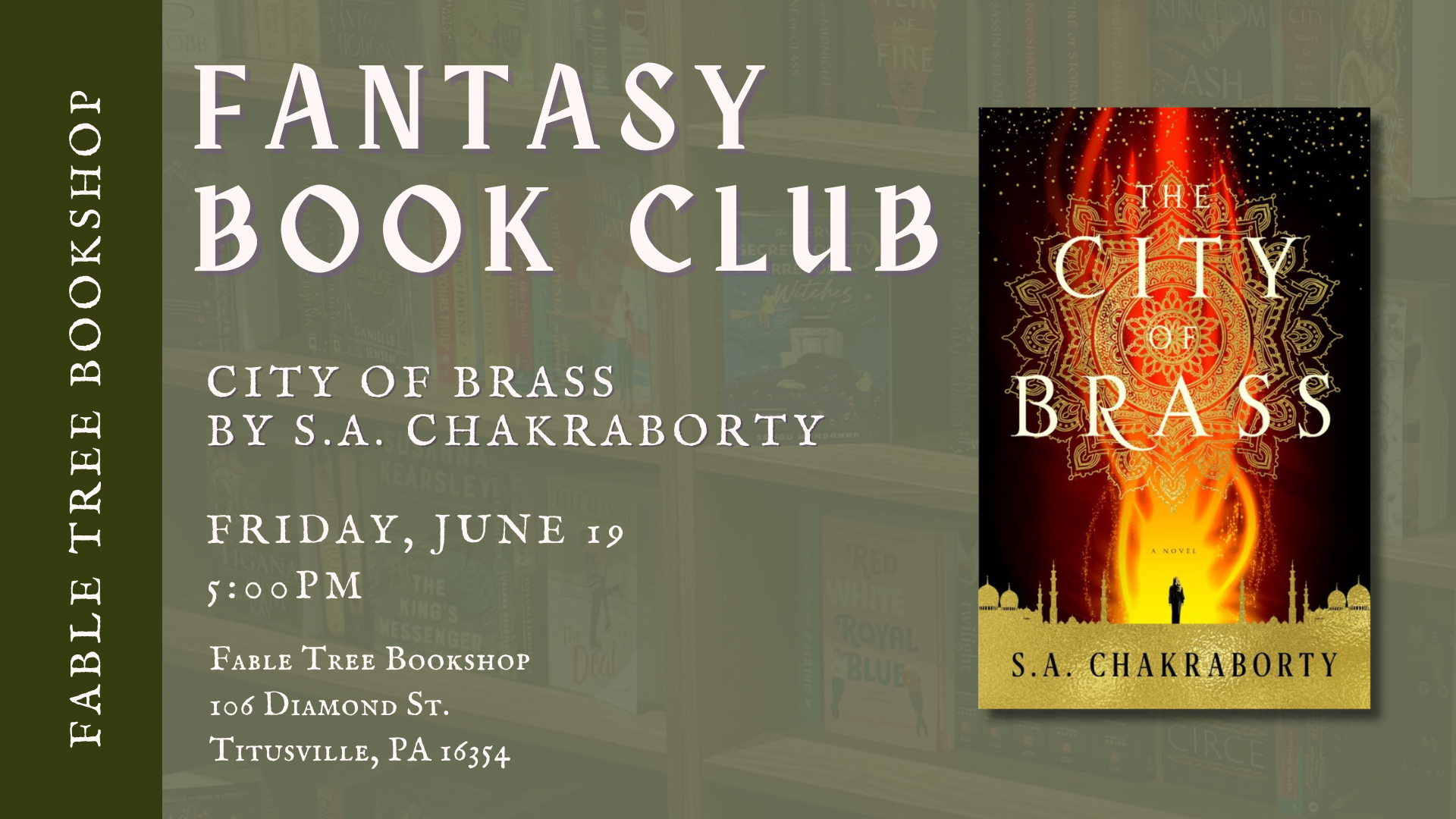 We will meet to discuss City of Brass by S.A. Chakraborty AND the third book in the Dungeon Crawler Carl series. Feel free to read either book or both!