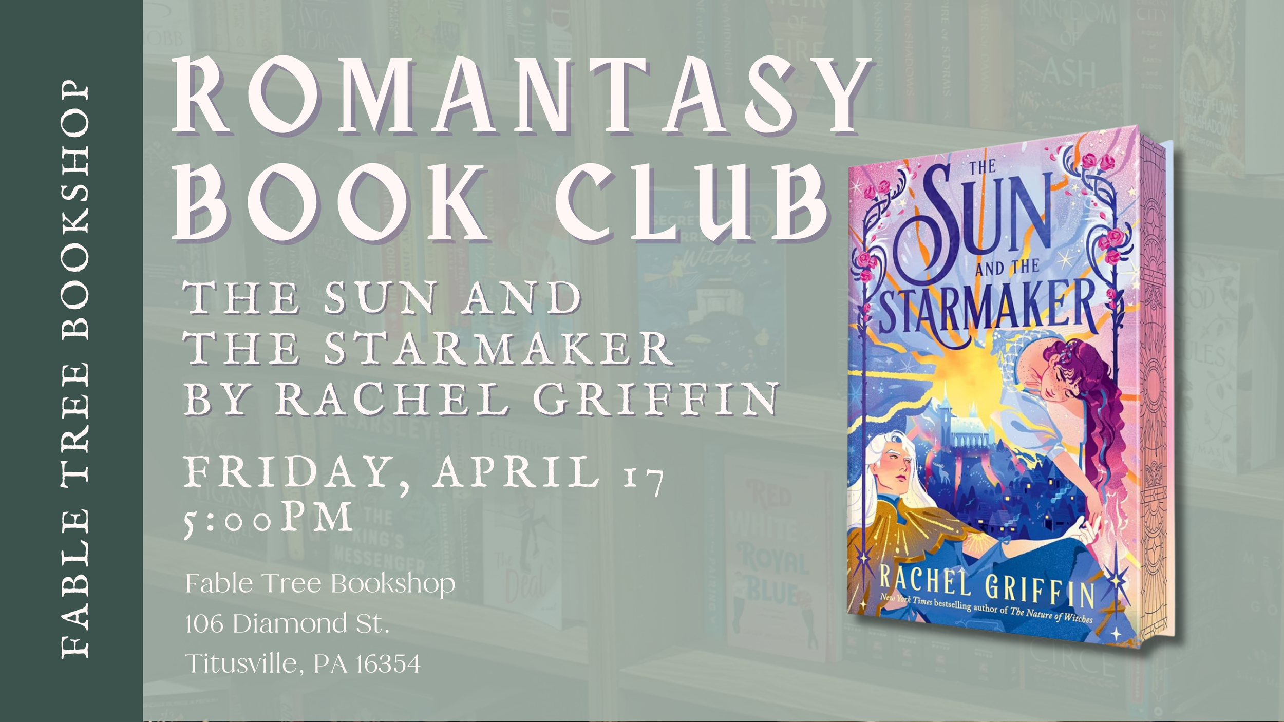 Join us to discuss April’s Romantasy Book Club pick: The Sun and the Starmaker by Rachel Griffin. Those who purchase their books at Fable Tree Bookshop will receive a free enameled pin while supplies last (we have 15).